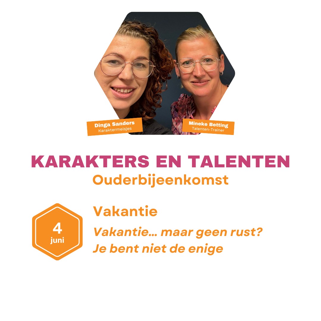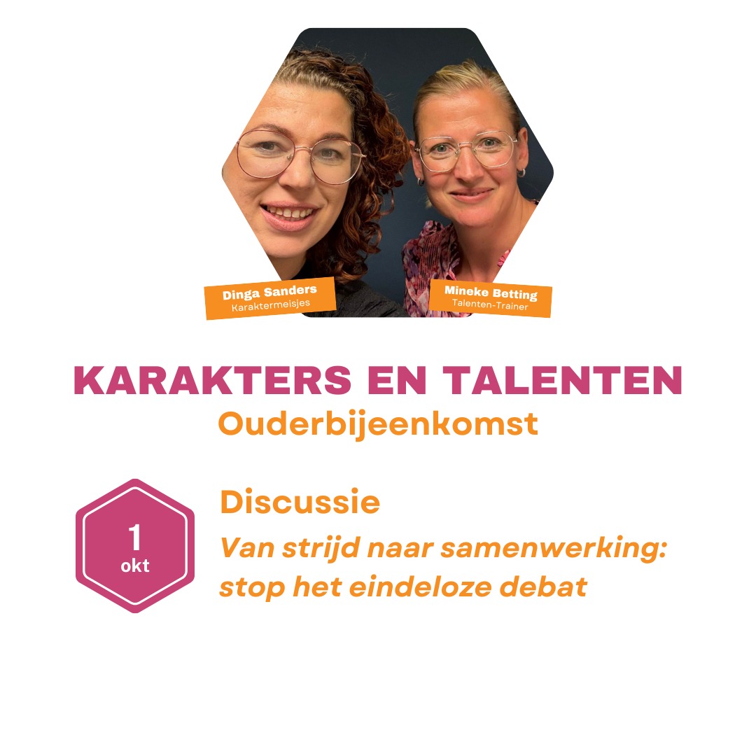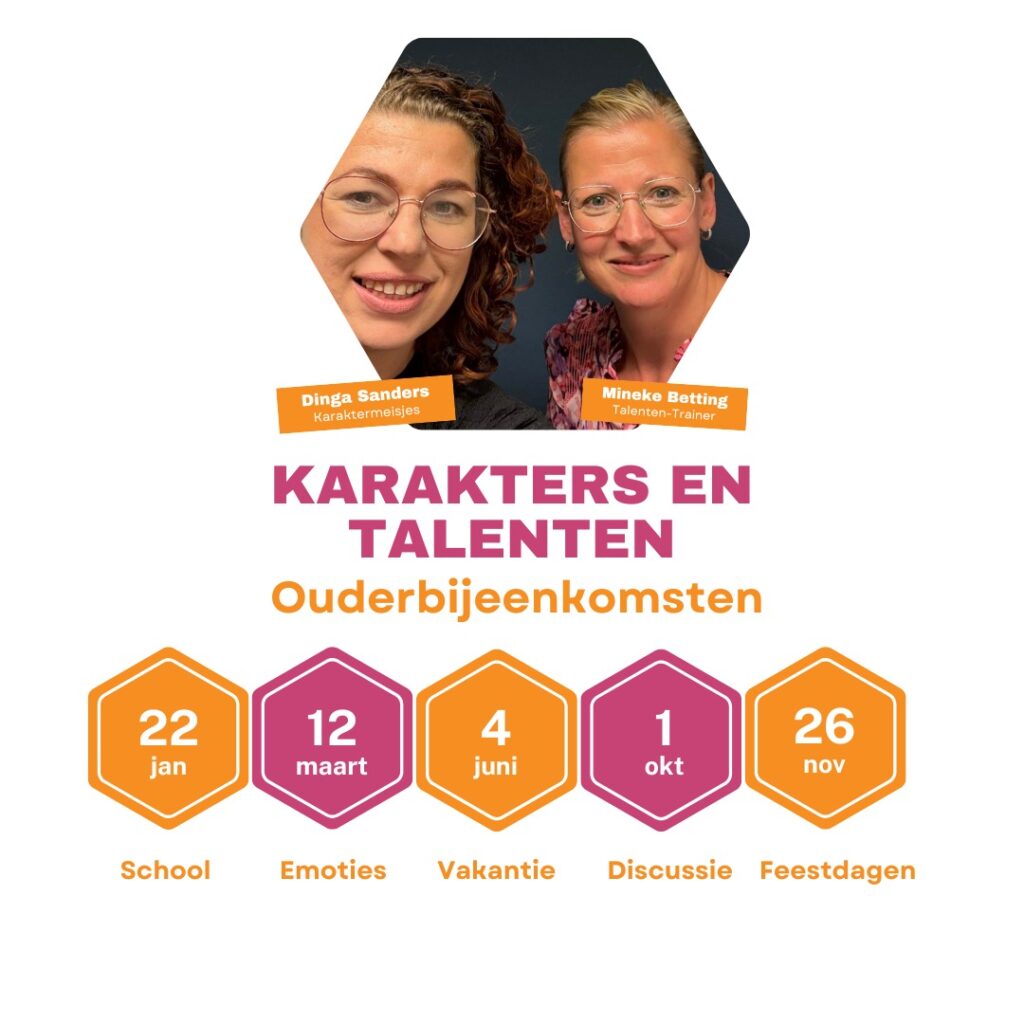 Geef je dan snel op voor de overige 2 data in 2026. Wij, Mineke Betting-Fukking (Talenten Trainer) en Dinga Sanders (Karaktermeisjes), organiseren voor het 2e jaar inspirerende ouderbijeenkomsten vol inzichten, herkenning en praktische handvatten.